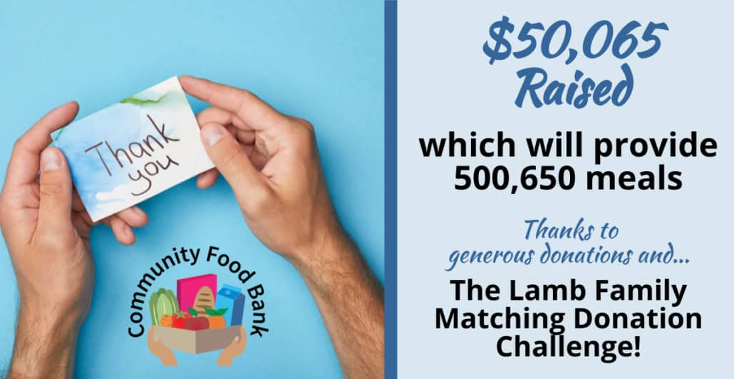 I want to express my deepest gratitude to each and every one of you who generously donated to the Community Food Bank as part of the Lamb Family donation match challenge. Thanks to your incredible generosity, we were able to raise a total of $50,065 which will provide 500,650 meals to our neighbors in need throughout Citrus, Hernando, and Sumter counties.